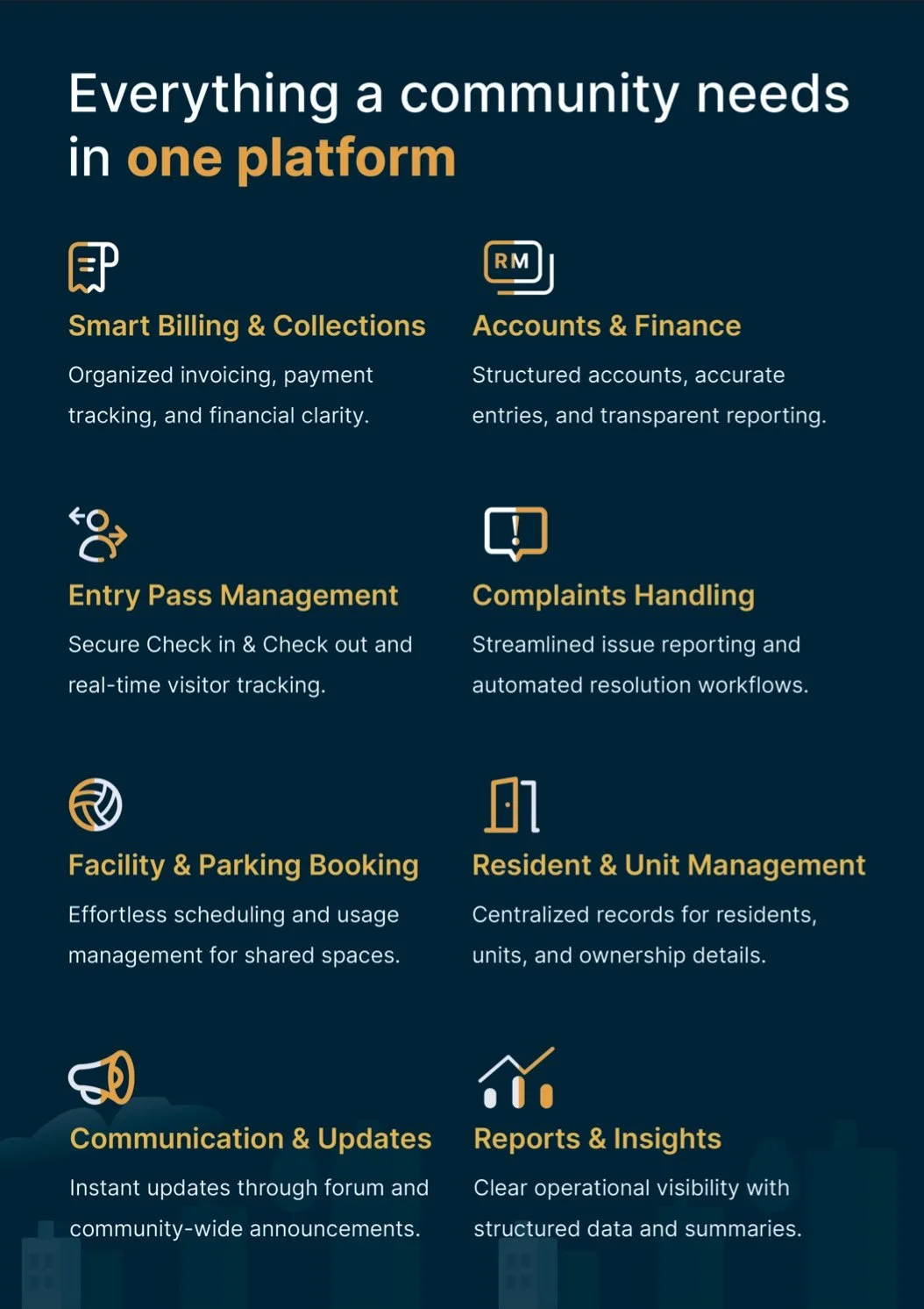 Operational Efficiency: Automated Complaints Handling, facility bookings, and centralized resident records.