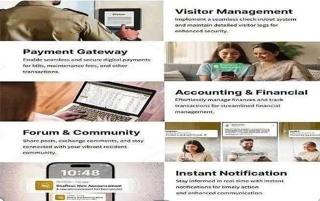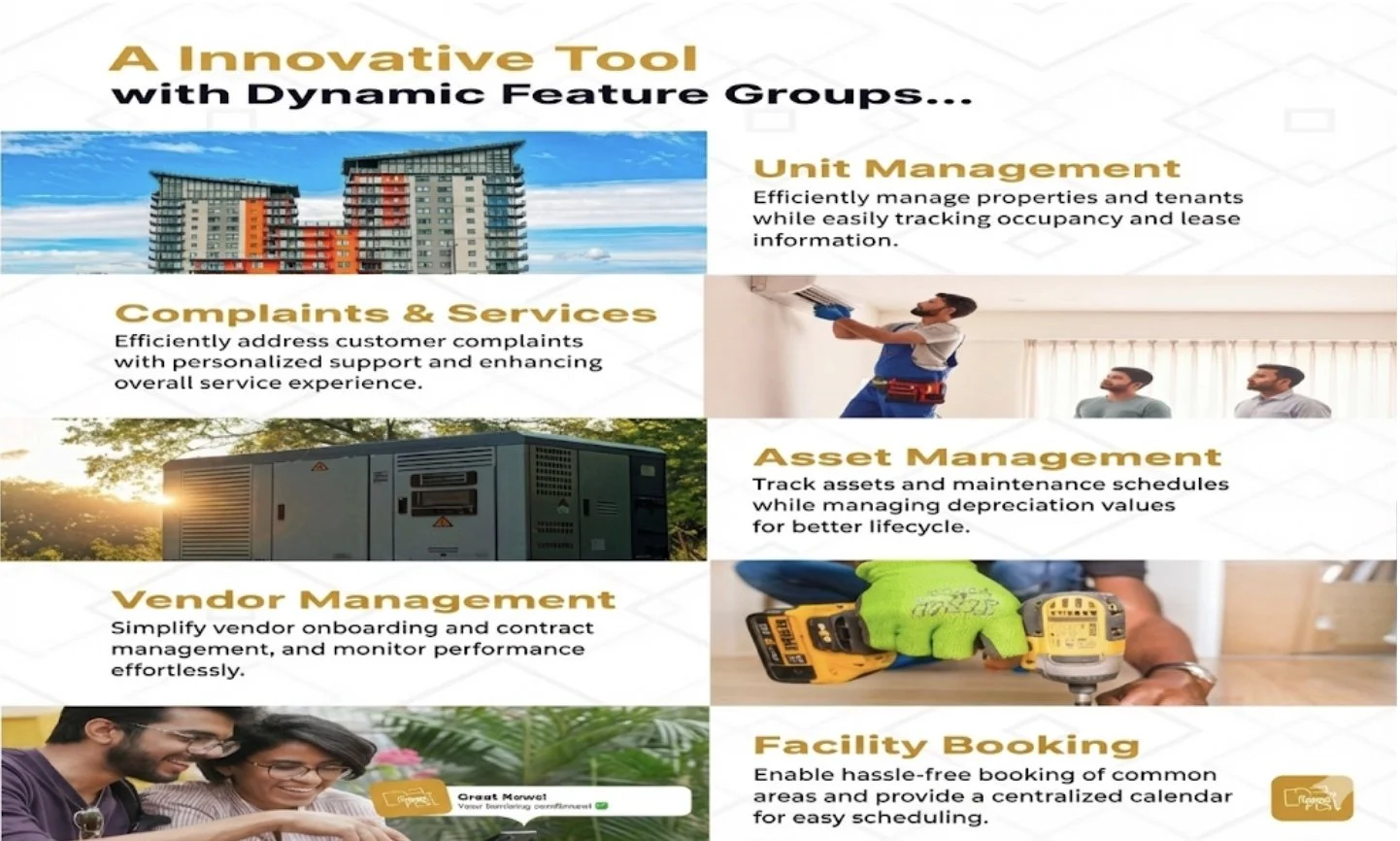 Key features include instant defect reporting, task tracking, facility booking, announcements, resident database management, and performance monitoring. These tools allow stakeholders to closely monitor progress, ensure accountability, and make informed decisions.